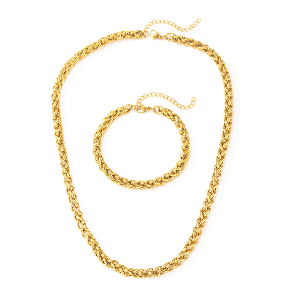 「ウィートチェーン(ホイップチェーン)」デザインのネックレスとブレスレットのセットです。編み込まれたチェーンが、光を多方向に反射し、首元と手元に圧倒的な存在感と気品を宿します。